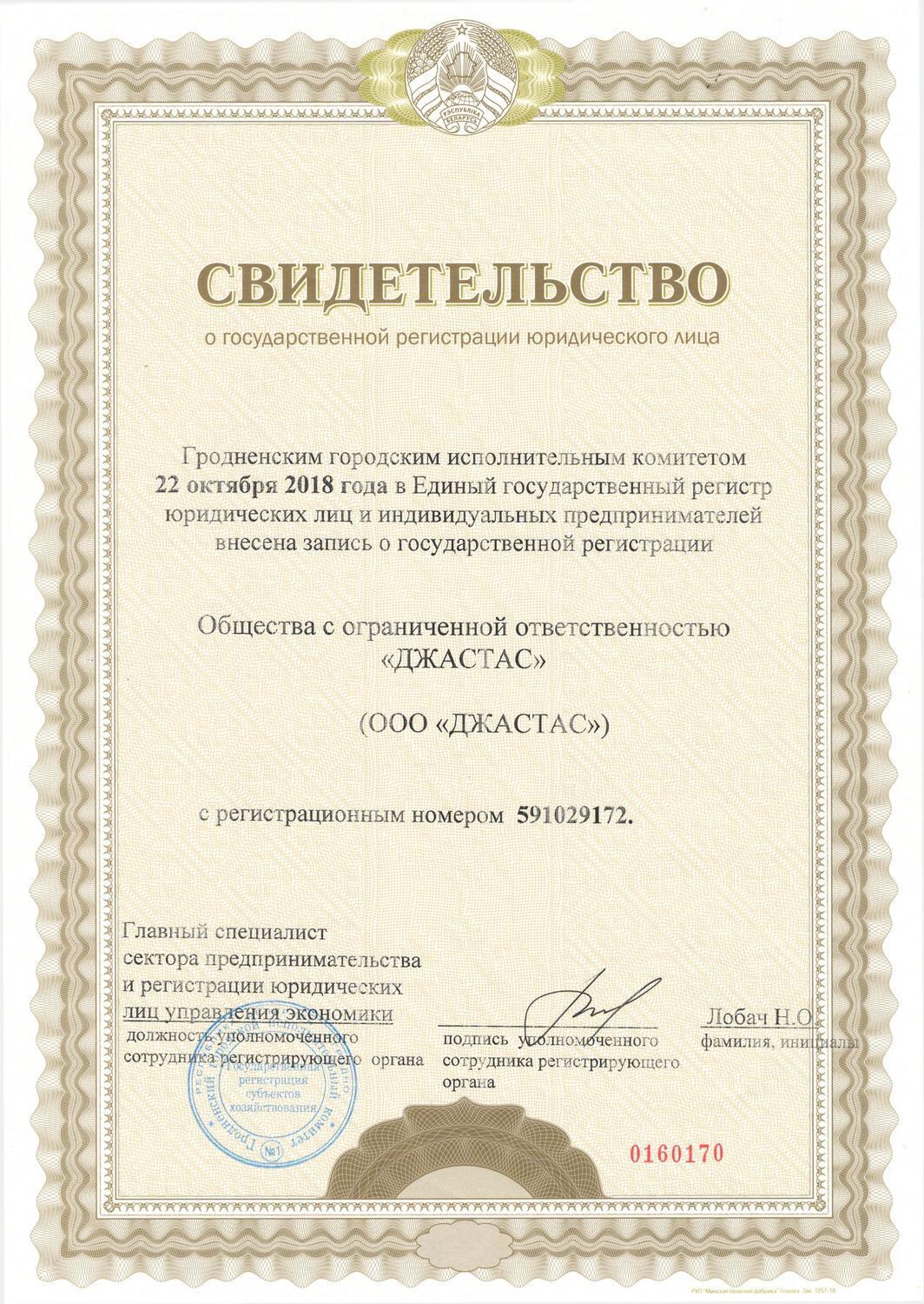 Свидетельство о гос. регистрации №0160170 от 22.10.2018 г. УНП 591029172.